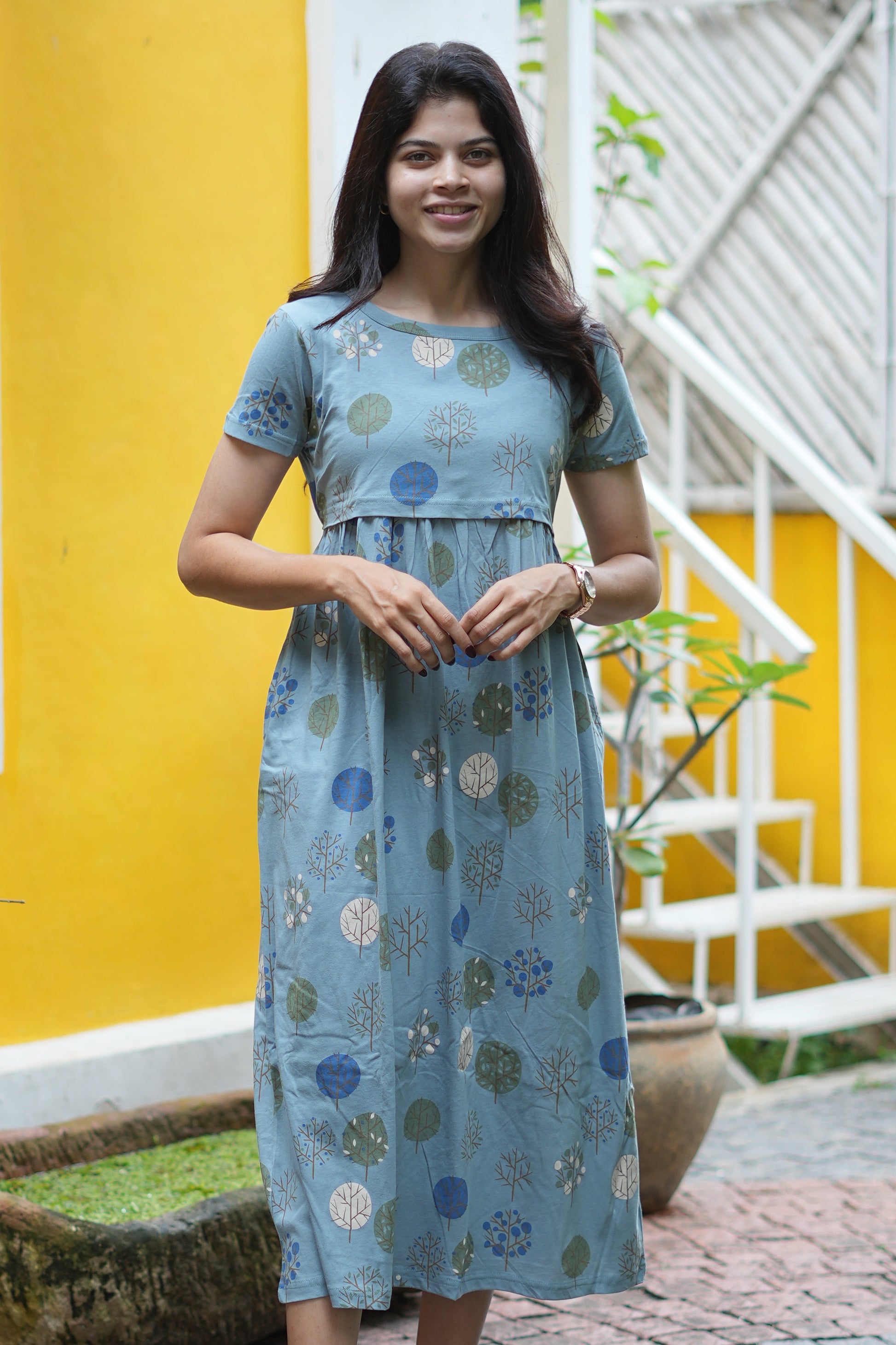 Please choose size only based on your bust measurements, fabric is stretchable, so it will adjust with your growing baby bump until 9 months and can be adjusted with back rope post delivery