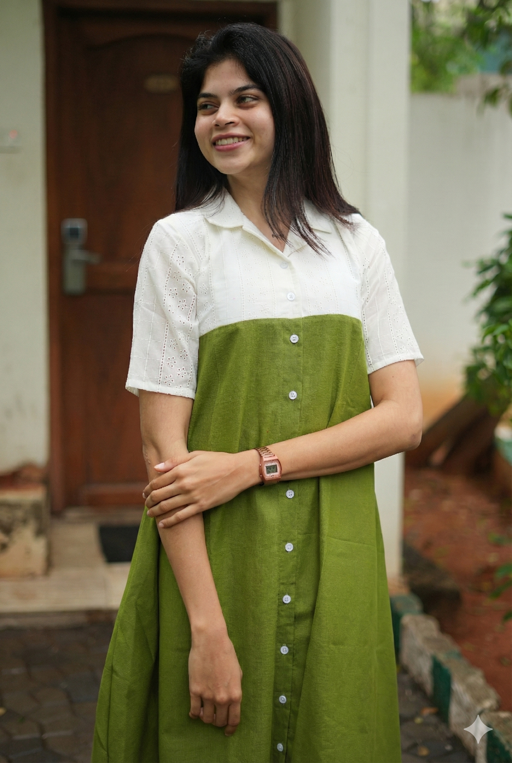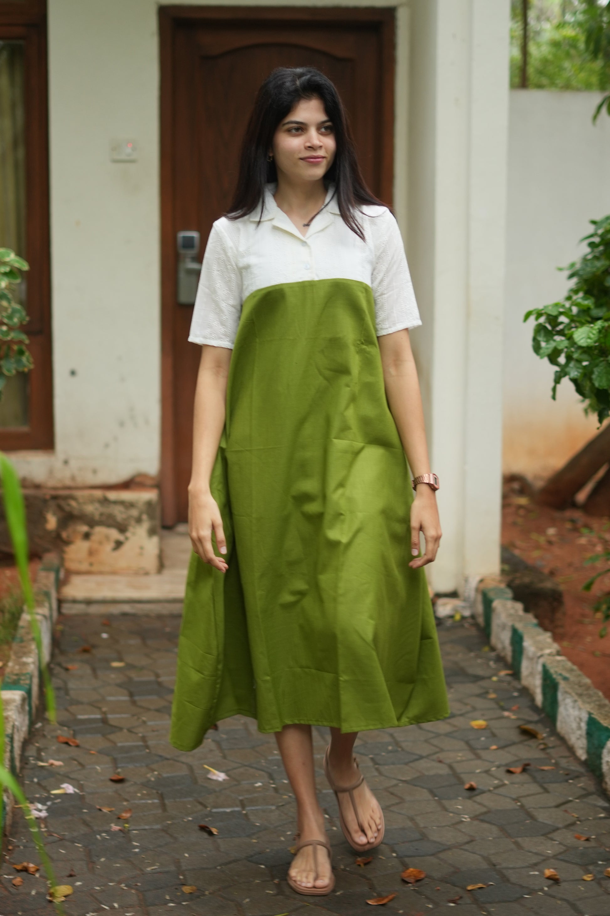 A refreshing two-tone combination – a white hacoba embroidered top paired with a solid olive green bottom, giving a clean and elegant contrast.